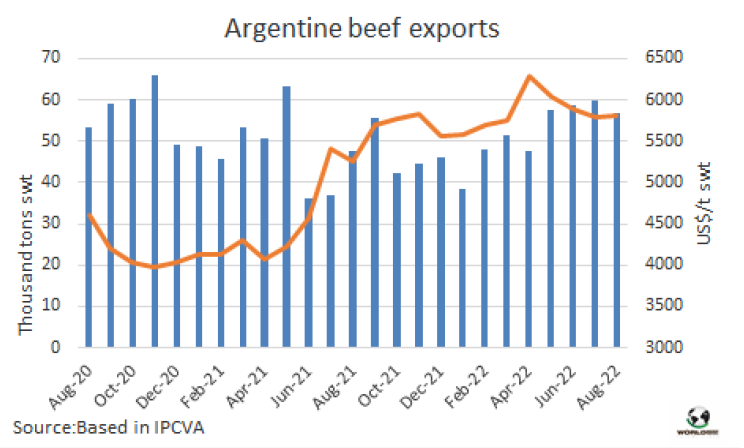 8月阿根廷對(duì)中國(guó)的出口大幅下降,為4.16萬(wàn)噸,其中8700噸是帶骨牛肉。冷凍去骨牛肉對(duì)中國(guó)出口量3.28萬(wàn)噸,環(huán)比下降20%。中國(guó)在阿根廷肉類出口中的份額從上個(gè)月的82%下降到8月份的73%。阿根廷牛肉出口商會(huì)指出:“2022年8月出口到中國(guó)的去骨牛肉的平均價(jià)格略高于5500美元/噸,與去年5月的5900美元/噸的峰值相比有明顯下降”。