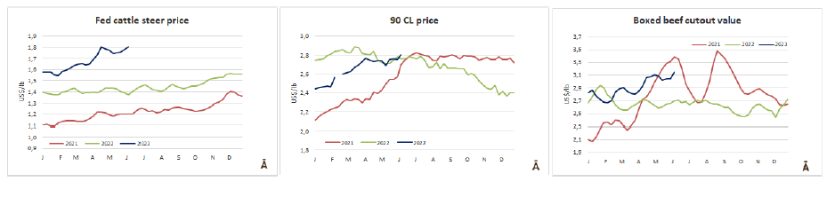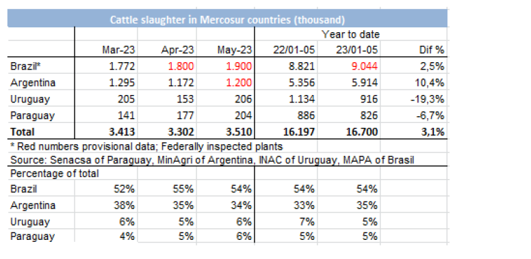5月份,有206,164頭牛被屠宰,比2022年同月少了近42,000頭(-17%)。今年前五個(gè)月累計(jì)共屠宰了915,955頭牛,比2022年同期減少219,000頭(-19%)。
