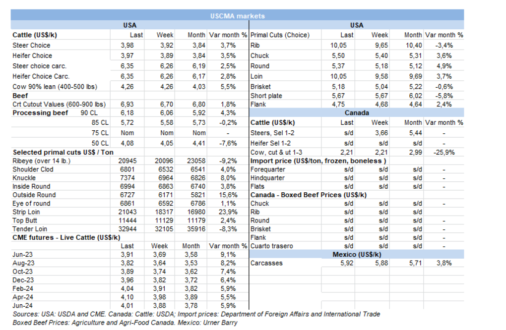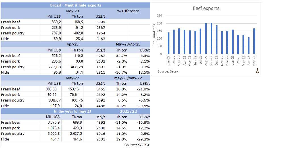 外貿(mào)部報(bào)告稱(chēng),5月巴西出口了168,510噸牛肉,出口額8.59億美元,均價(jià)為每噸$5099。由于往中國(guó)出口更加順暢,與4月份相比,數(shù)量增長(zhǎng)了53%(超過(guò)5.8萬(wàn)噸),均價(jià)回升了6.5%。是2022年10月以來(lái)最大出口量。