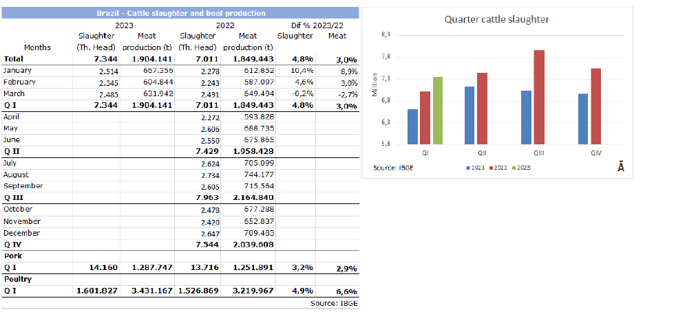 根據(jù)巴西地理和統(tǒng)計(jì)局昨天發(fā)布的詳細(xì)報(bào)告顯示,2023年第一季度中巴西屠宰??偭繛?span>734萬(wàn)頭,同比增加4.8%。由于胴體均重下降了4.5%,達(dá)到259.3公斤,牛肉產(chǎn)量較去年增加了3%達(dá)到185萬(wàn)噸。