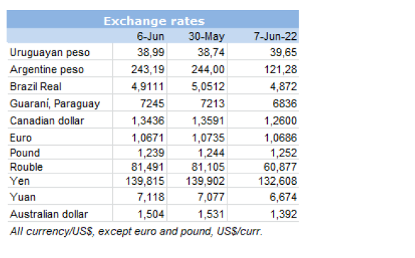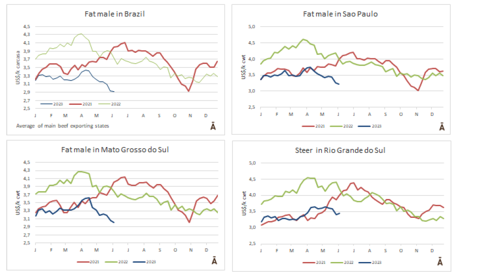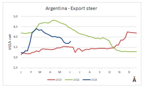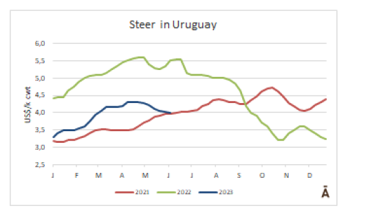 在烏拉圭和巴拉圭,價(jià)格趨勢(shì)是向下跌的,與低迷的國(guó)際環(huán)境一致。烏拉圭的閹公牛價(jià)格下降了3美分-4美元每公斤。