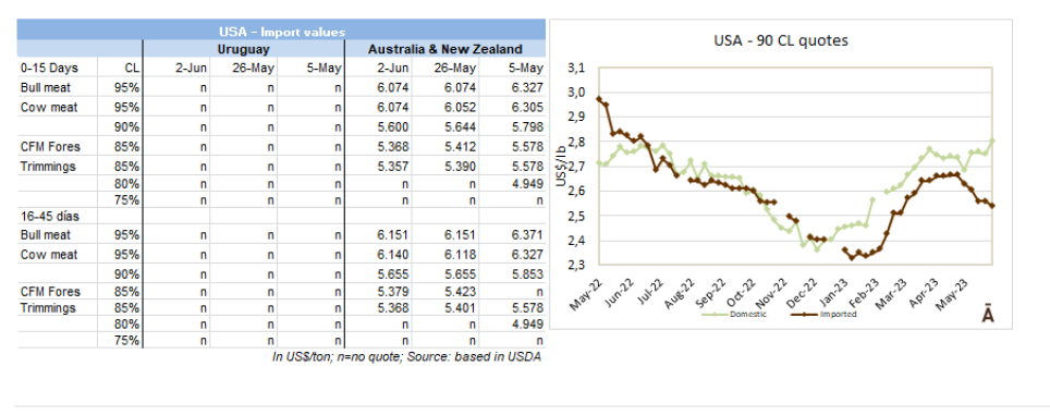 根據(jù)海關(guān)數(shù)據(jù),2023年1-5月,烏拉圭牛肉累計(jì)出口達(dá)13.8萬(wàn)噸,同比減少22%。均價(jià)同比降低了14%,至每噸$6001。