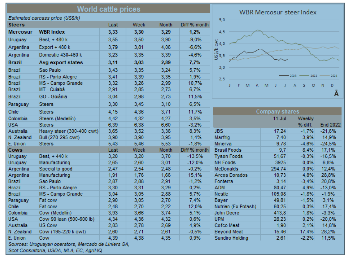 在國際市場穩(wěn)定的支持下,極低的供應和比較大的購買興趣使市場更加穩(wěn)定。此外,Marfrig-Colonia 恢復了工作,因此只剩下Marfrig-Inaler and Minerva-Canelones兩家公司沒有交易。