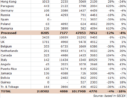 第二個主要目的地是智利,有近10000噸,其中近80%是冰鮮的的。緊隨其后的是菲律賓,出口量達到5278噸。