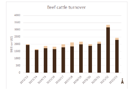 2022/2023財年,牛的最終銷售額約(包括屠宰和活牛)24.5億美元,年降幅為9億美元(-27%),當時開具了33.4億美元的發(fā)票。銷售量和平均銷售價格下降導致了牛營業(yè)額的下降。