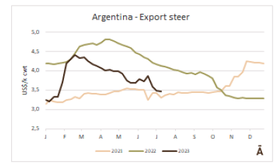 阿根廷和巴拉圭的情況正好相反。在阿根廷,公牛出口的價格并沒有抵消官方匯率的貶值,所以公牛的價格每公斤損失2美分,至每公斤3.79美元,其中包括9%的牛肉出口稅。