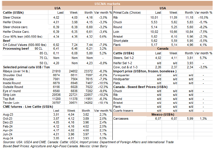 牛屠宰市場擺脫了5、6月期間普遍存在的劇烈下跌趨勢,上周一些特殊產(chǎn)品因為沒有達到理想的價格而成交。
