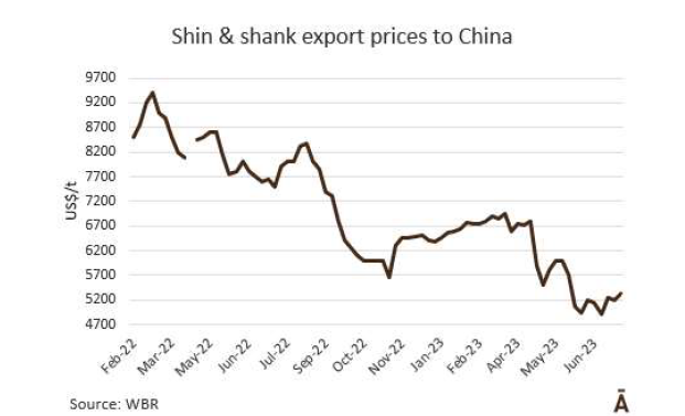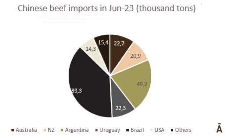 到目前為止,2023年,牛肉出貨量達到32.2萬噸,比2022年同期增加了約2萬噸(6.8%),主要原因是對中國銷售額的增加,中國的牛肉量占79.0%。以色列緊隨其后占5.6%,德國占3.6%;美國為2.9%,智利為2.7%。2022年7月至2023年6月,牛胴體重量出口累計91.7萬噸,此外還有99.5萬帶骨肉和牛骨,價值超過30.21億美元。牛內(nèi)臟出口量下降了20%至9800噸,價值近1400萬美元 .
