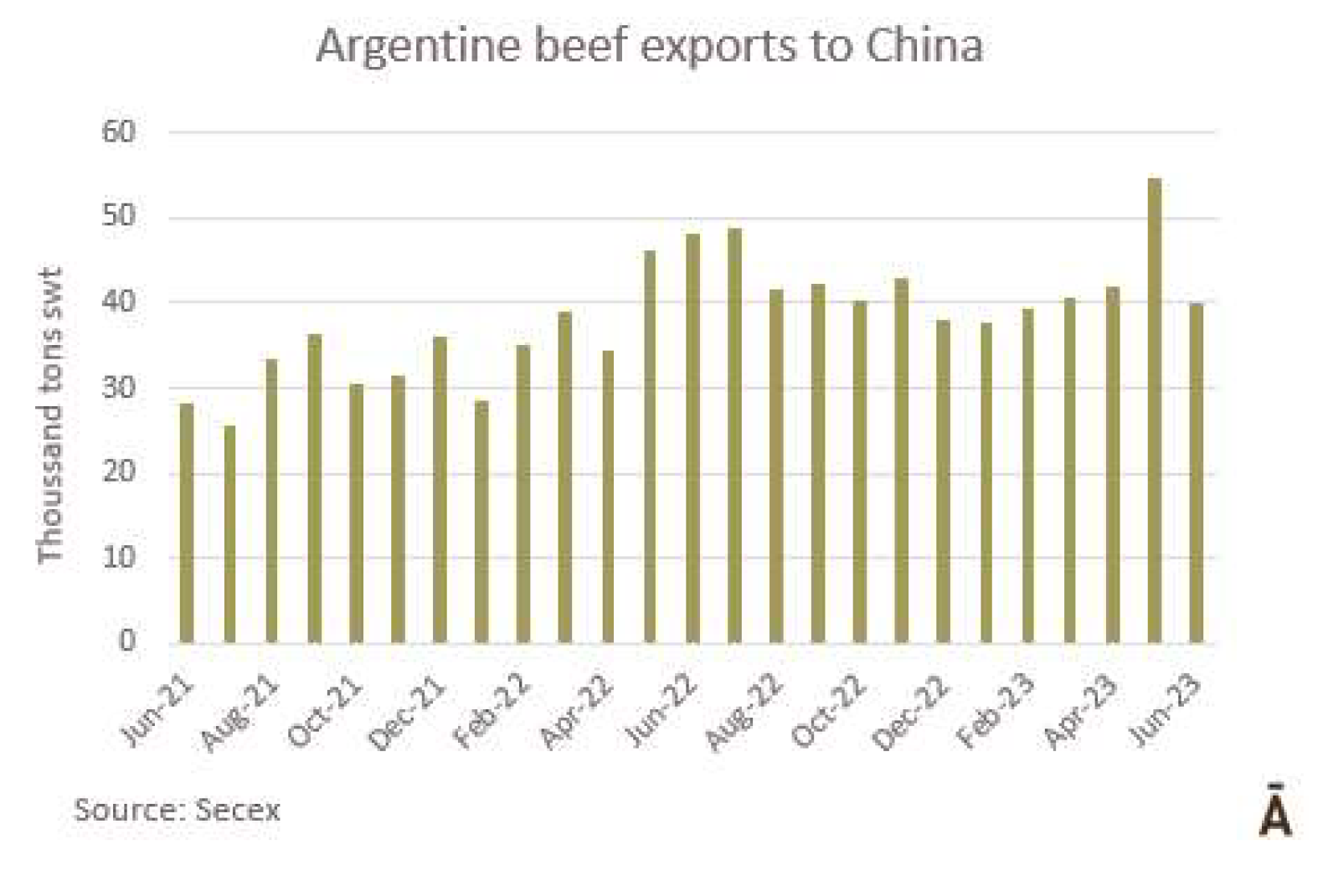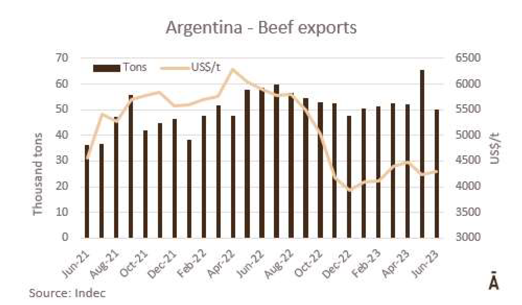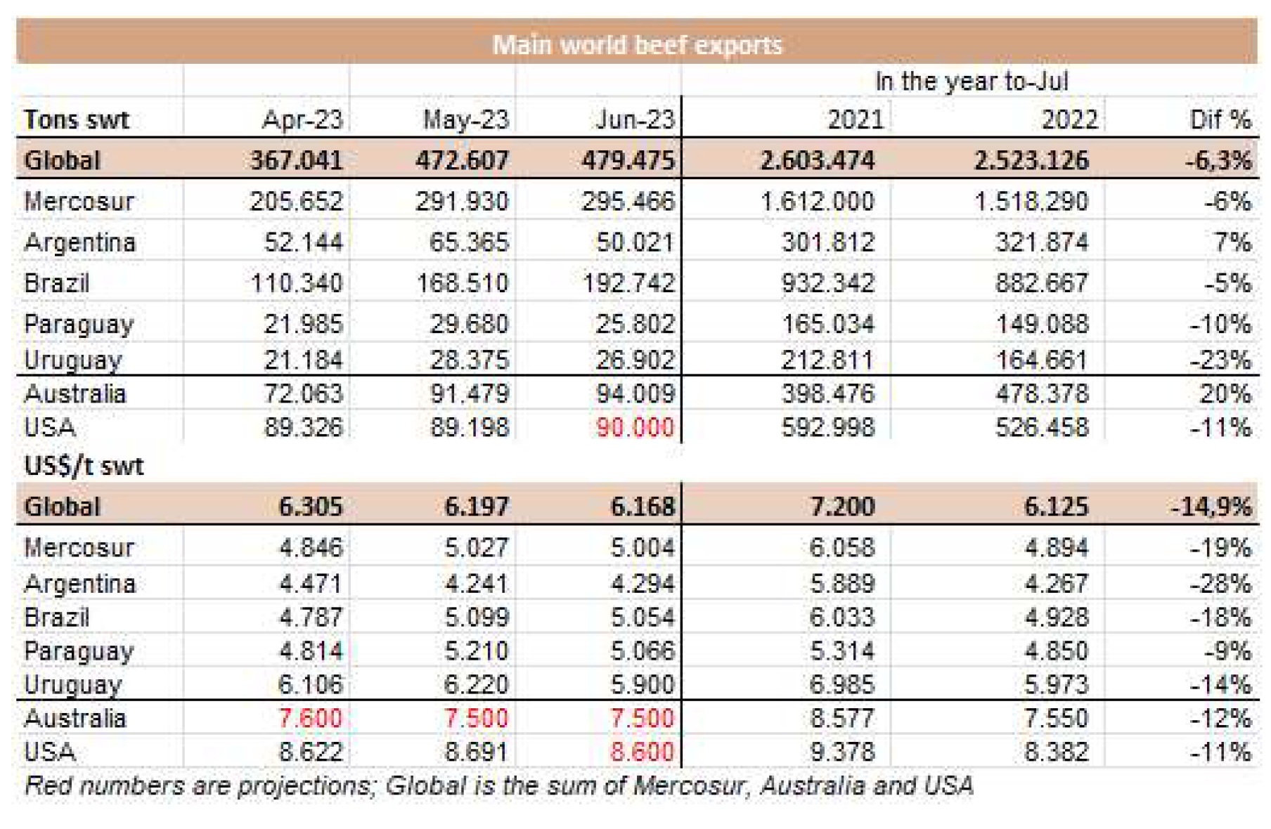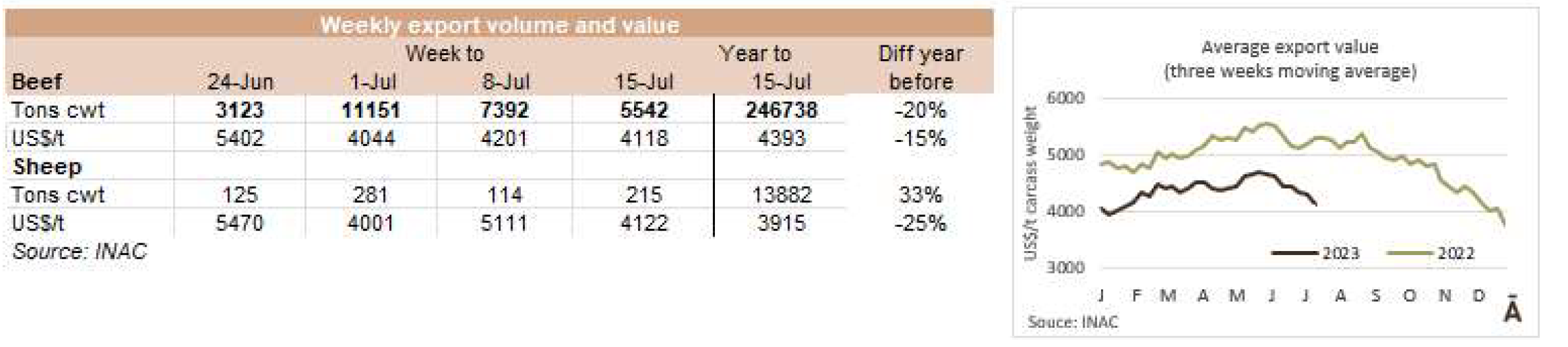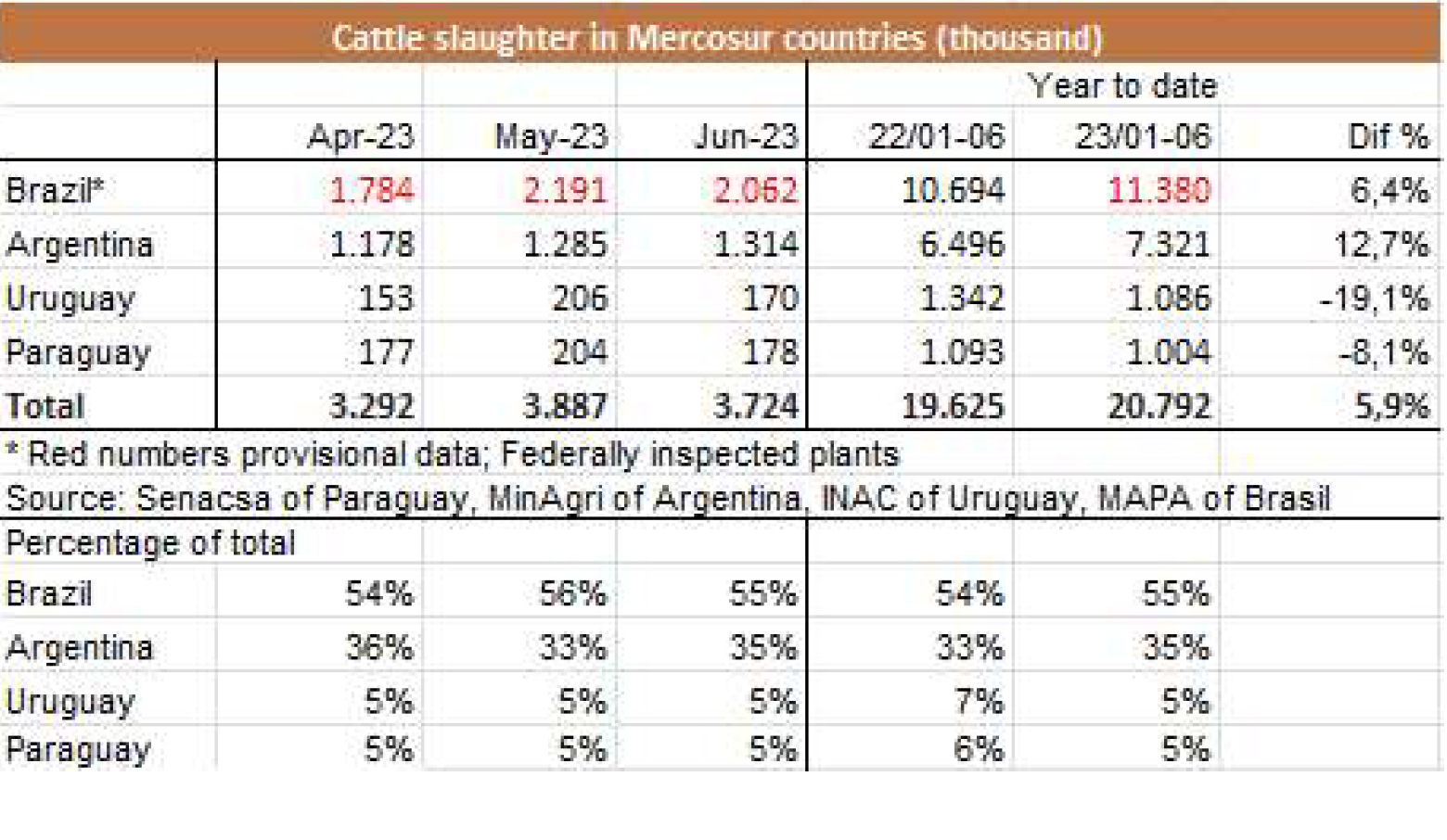 6月份冰鮮、冷凍和加工牛肉的出口總量略高于5萬噸(4.1萬噸肉和0.9萬帶骨肉)。根據(jù)統(tǒng)計,這是2023年迄今為止的最低月產(chǎn)量,比去年5月低24%,比6月低15%。SENASA衛(wèi)生服務(wù)部門的數(shù)據(jù)顯示六月份出口量比5月高,差異“主要是運往中國的數(shù)量上,實際上比預(yù)計少1萬噸?!?/span> 據(jù)美國廣播公司報道,“牛肉屠宰和生產(chǎn)一直處于高水平,6月份出口量的意外下降,主要是由于在支付國外運費方面出現(xiàn)了困難。就貨值而言,6月份的出口額接近2.15億美元,比上月降低22.5%,比去年的3.46億美元降低了38%。