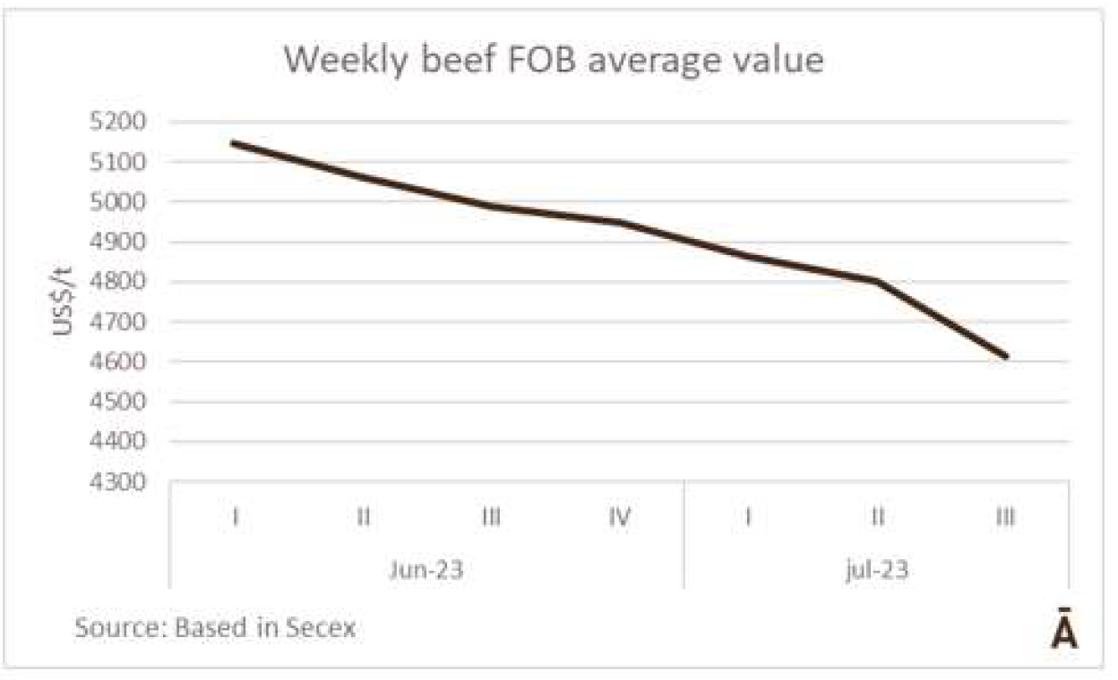 根據(jù)外貿(mào)部(Secex)報告,7月第三周,巴西以每噸平均4613美元的價格出口了41000噸牛肉。與本月前兩周相比,成交量有所增長,而平均價格保持持續(xù)下降趨勢。與6月前6個工作日(六周前)相比,平均出口價格下降了10.3%,即532美元/噸。在7月的前15個工作日,巴西出口117590噸牛肉,本月的牛肉總量預(yù)計為16-16.5萬噸,比6月減少了約3萬噸。