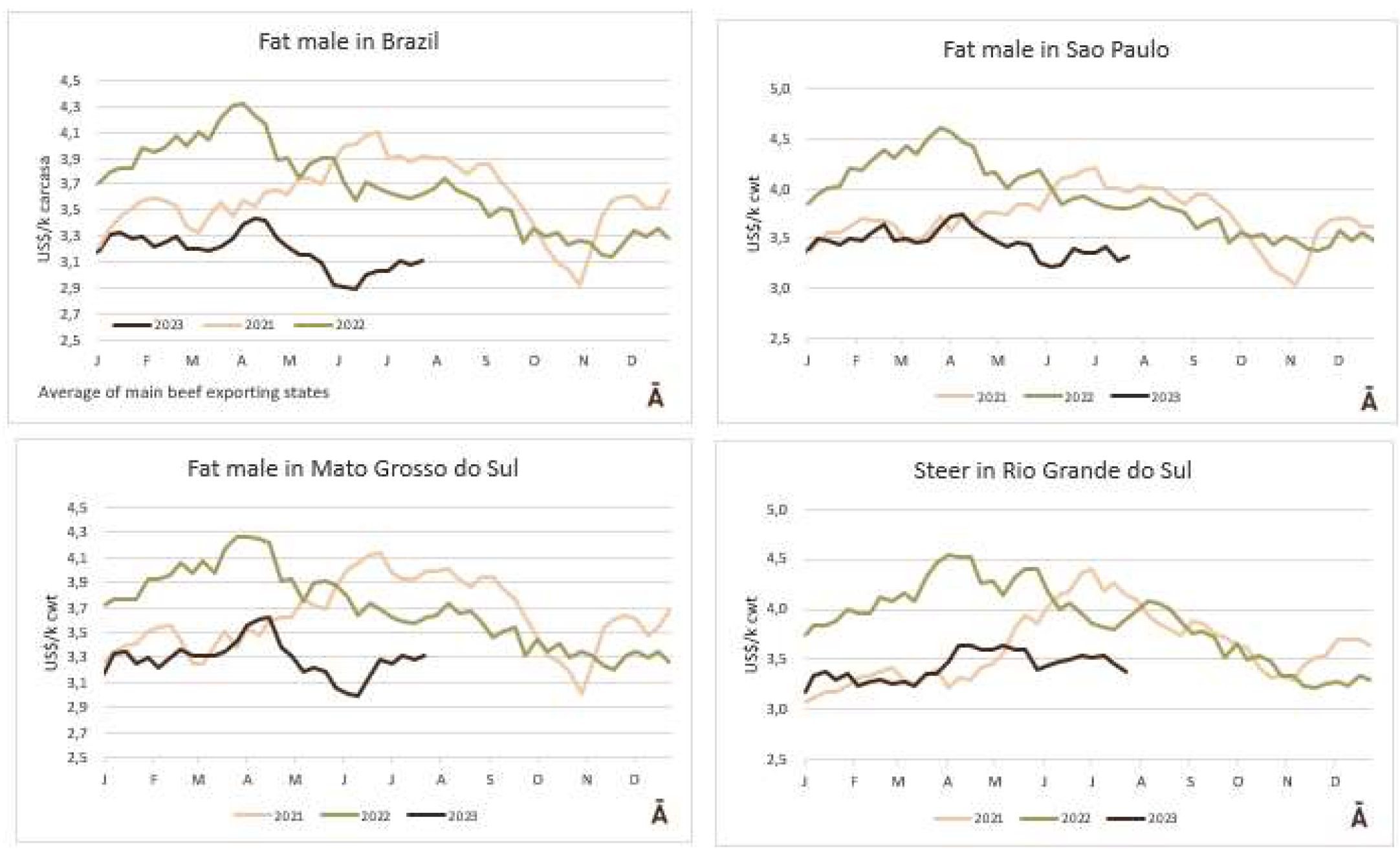 經(jīng)過前一周的下調(diào),本周巴西主要養(yǎng)牛區(qū)的屠宰牛價格保持穩(wěn)定。圣保羅州普通育肥牛平均價格是236.5雷亞爾/15公斤,出口中國市場30月齡以下的育肥牛價格高10雷亞爾/15公斤。巴西主要的牛市場價格與上周保持一致;批發(fā)市場的牛肉庫存給宰牛的價格造成了下行壓力。8月初,隨著父親節(jié)需求的增加,價格預(yù)計會上漲。