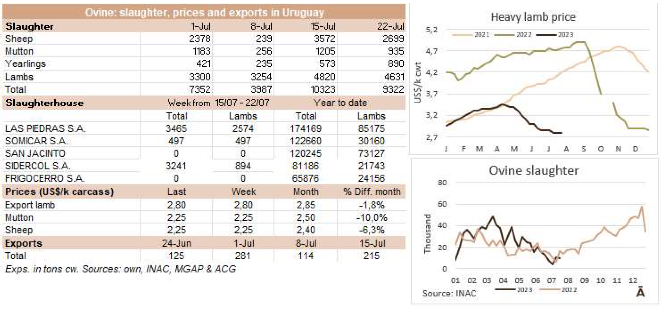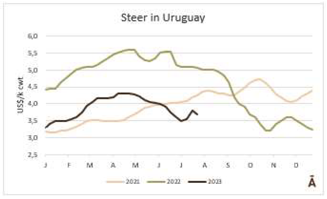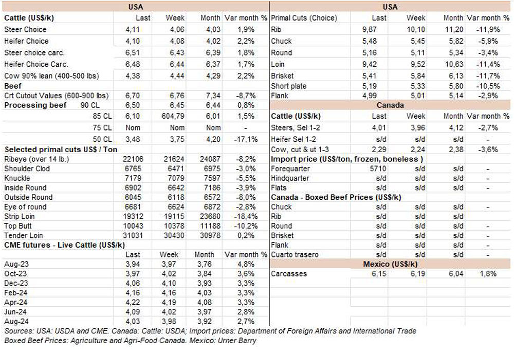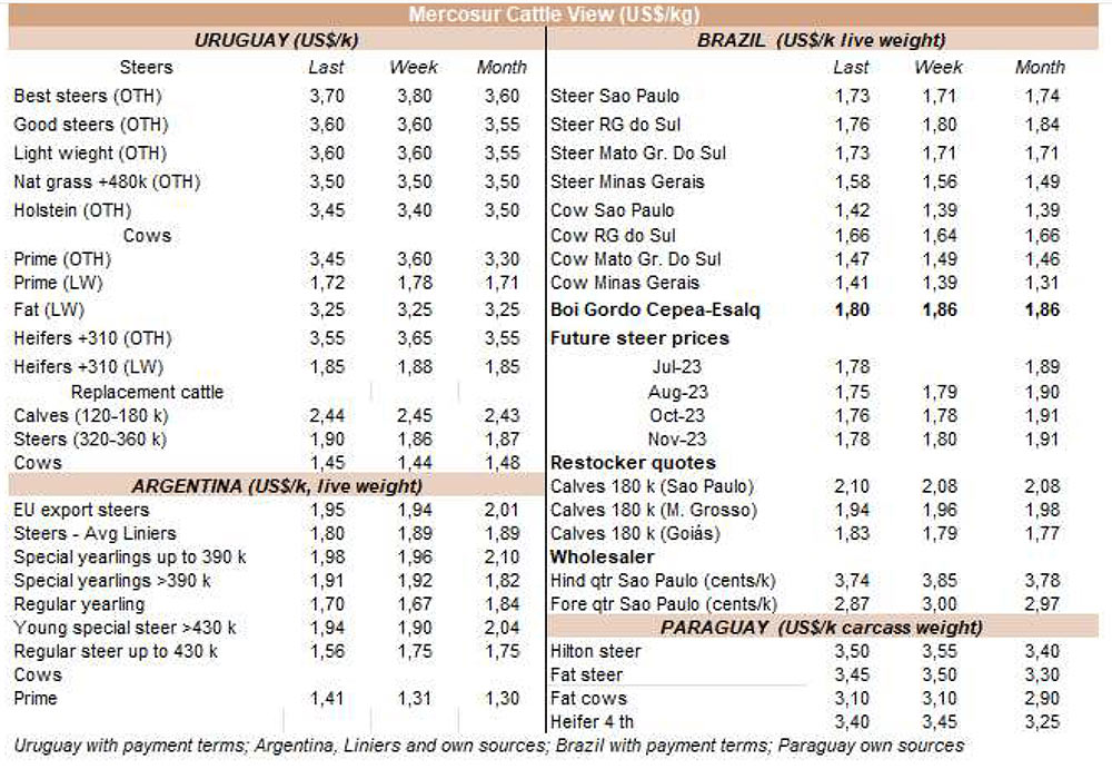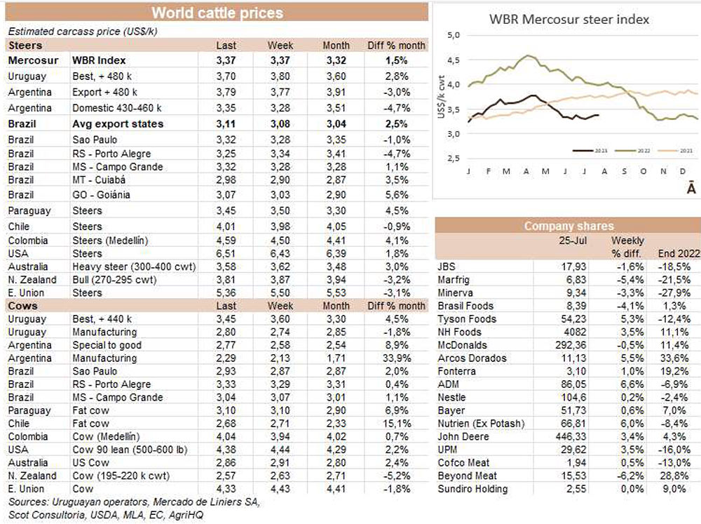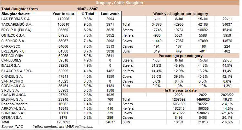由于7月18日的非工作假期,上周的牛屠宰量下降約7500頭,與去年非常相似(-1%)。INAC報告稱,有34637頭牛進入工廠。奶牛周減少量為15%(14576頭),是減少比例最小的。奶牛屠宰量占總量的42.1%,是今年迄今為止的最高比例。另外15416頭公牛(周減少量為-18%)和3959頭小母牛(周減少量是29%)被屠宰。屠宰量最大的公司是Marfrig-Takuaremb6(3971),Minerva、Pulsa(3625)和Carrasco(3513)。Marfrig在一周內(nèi)屠宰了8710頭牛,而Minerva和另外兩個工廠這周屠宰了7138頭牛。7月份的前22天,牛屠宰數(shù)量達到121942頭,比2022年同期高14.4%。這樣一來,本月的屠宰量肯定會出現(xiàn)強勁的收縮趨勢。連續(xù)13個月下降后,與上年同月相比首次出現(xiàn)增長。