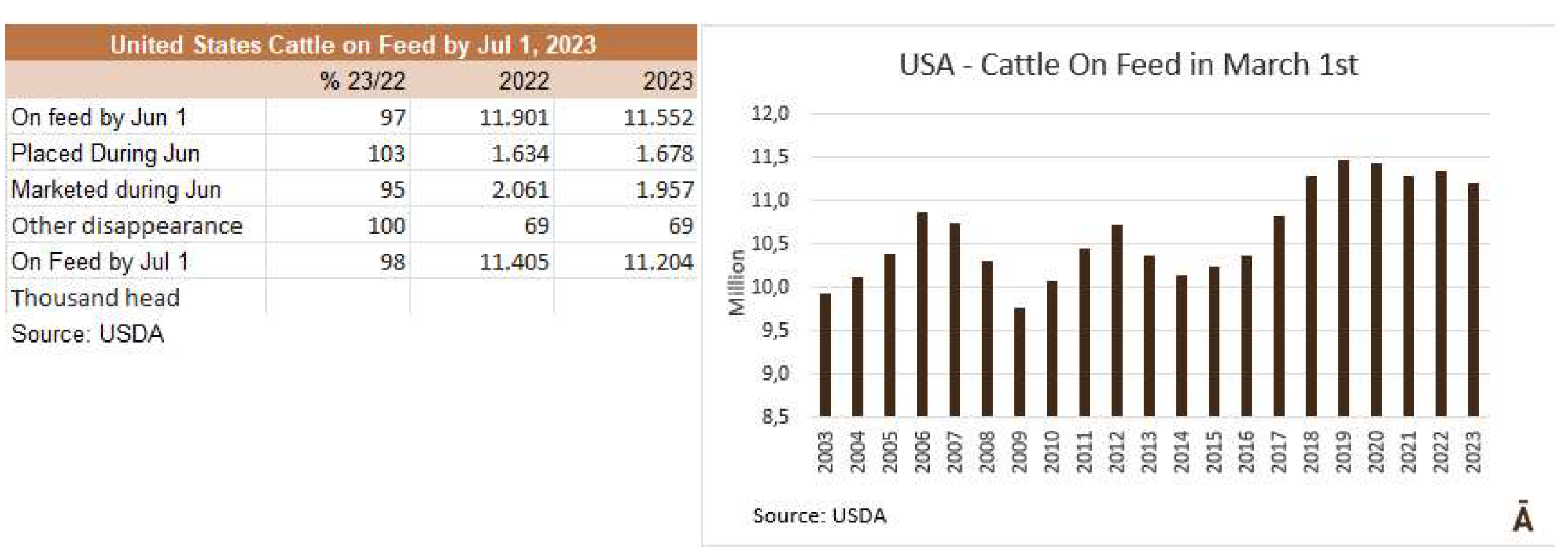 美國農(nóng)業(yè)部國家農(nóng)業(yè)統(tǒng)計局稱7月 1日牛庫存的數(shù)量是9590萬頭,比去年的9860萬頭低3%,是自1971年以來最小的庫存。所有奶牛和小母??傆?/span>3880萬頭,比2022年7月1日的3960萬頭低2%。2940萬頭的肉牛比一年前減少了3%。奶牛數(shù)量為940萬頭,與前一年相比沒有變化。
