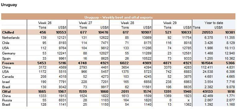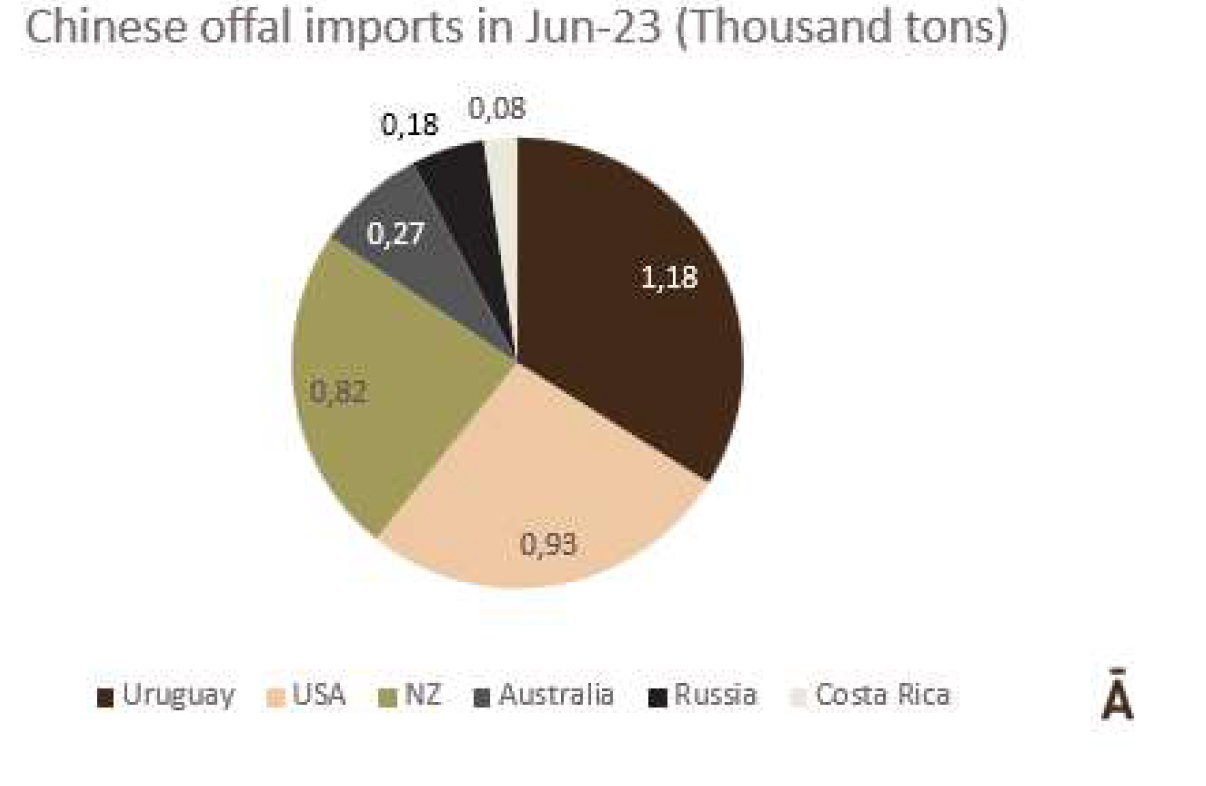6月份,中國進口了3471噸牛內(nèi)臟,其中1178噸(34%)來自烏拉圭。巴西和阿根廷的內(nèi)臟不能直接進入中國市場。6月份排名靠前的其他兩位供應(yīng)商是美國(27%)和新西蘭(24%)。從烏拉圭進口的內(nèi)臟平均價格為5485美元/噸,而從美國進口的內(nèi)臟平均價格是4897美元/噸,從新西蘭進口的內(nèi)臟價格為6014美元/噸。