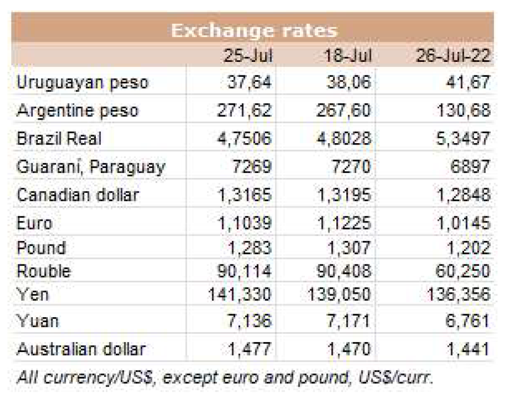 一位貿(mào)易商稱,智利進口市場保持著控制“邊境開放的情況下貨物的具體到貨量”的節(jié)奏。 他補充道,烏拉圭和巴西的19-20分體價格是CIF 5400-5600。消息人士評論道:“智利人正在等待市場吸收即將到來的東西,以便在國慶節(jié)期間外出購買,今年的國慶節(jié)會有點復(fù)雜?!?。