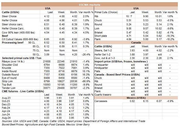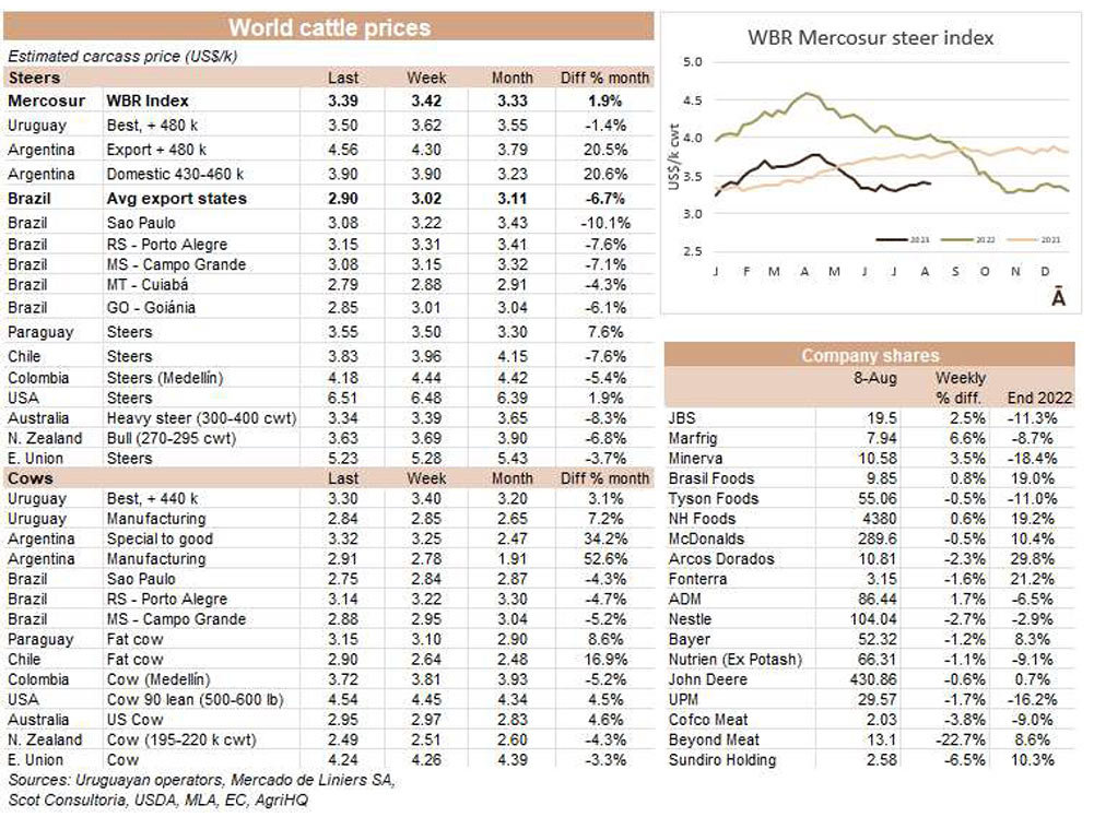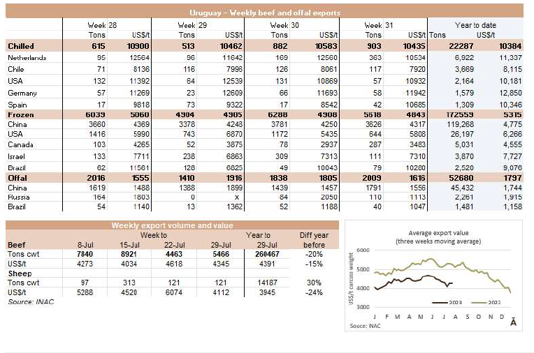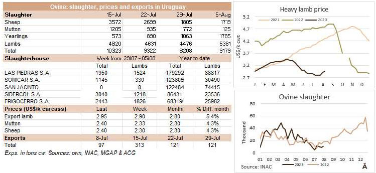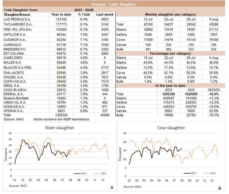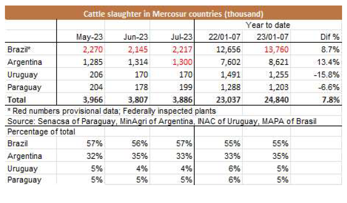 上周屠宰量大幅上升。INAC報(bào)告稱,截至8月6日,有45086頭牛進(jìn)入屠宰場(chǎng),比上一次增加了5500頭,是自5月中旬以來(lái)的最高值。屠宰的組成比例清楚地反應(yīng)了481配額。小母牛是增長(zhǎng)數(shù)量最多的,總共有7067頭,這是自2月份以來(lái)的最高值。本周,公牛增加2700頭達(dá)到了21112頭。不屬于配額的奶牛僅占屠宰量的36%,有16188頭。本周屠宰最多的工廠是Marfrig-Tacuarembo(5140)、Las Piedras(4853)和Ontilcor(4247)。7月份屠宰量是169558頭牛,同比增長(zhǎng)了13.6%。這是自2022年5月以來(lái),年度牛屠宰量首次增加。