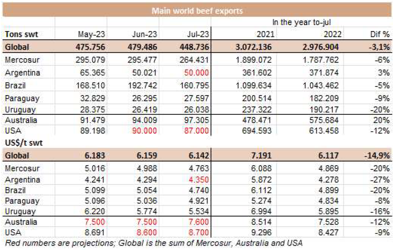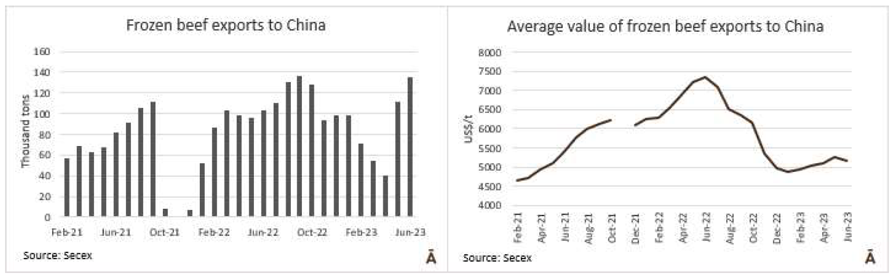 7月份對(duì)中國(guó)牛肉出口大幅下降,可以看出中國(guó)對(duì)牛肉需要的減弱。前一個(gè)月相比,降幅將在5至21萬(wàn)噸左右。大部分牛肉,尤其是來(lái)自南方共同市場(chǎng),將于8月中旬至9月中旬抵港。與上月相比,7月份巴西對(duì)中國(guó)的出口減少了4.3萬(wàn)噸,這是下降的主要原因。澳大利亞和烏拉圭的出口也有所下降,阿根廷的出口預(yù)計(jì)也出現(xiàn)了同樣的情況。美國(guó)農(nóng)業(yè)部預(yù)計(jì),中國(guó)今年將進(jìn)口350萬(wàn)噸牛肉,這意味著每月進(jìn)口量約22.7萬(wàn)噸牛肉,7月份的出口量低于這個(gè)數(shù)值。
