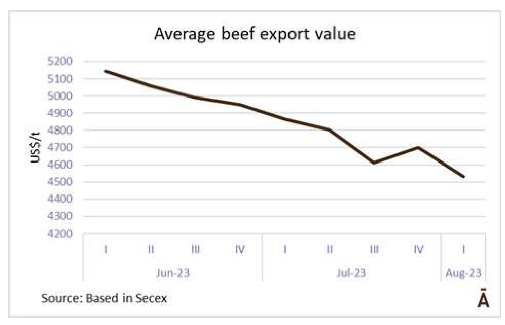 據(jù)外貿(mào)部(Secex)報(bào)告,8月前四個(gè)工作日,巴西出口了41267噸牛肉,平均價(jià)格為4532美元/噸。平均日產(chǎn)量為10317噸,為6月第一周以來(lái)的最高值。自6月初以來(lái)平均出口值呈下降趨勢(shì),價(jià)格下跌了12%,即613美元/噸。