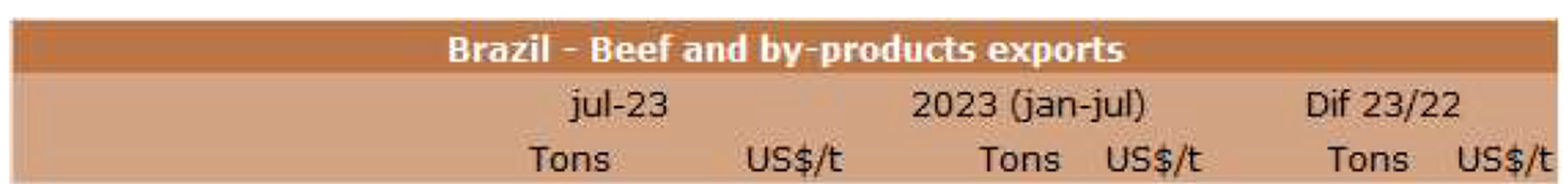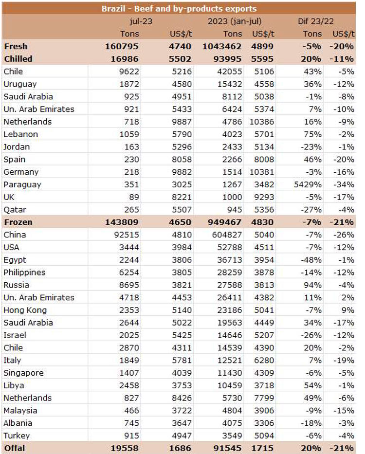 7月份,巴西對(duì)中國(guó)的冷凍牛肉平均出口價(jià)格為4810美元/噸,比6月份的平均出口價(jià)格每噸低350美元(-6.8%),為16個(gè)月前2021年3月以來(lái)的最低值。7月份中國(guó)出口量環(huán)比下降4.3萬(wàn)噸至92515噸。無(wú)論如何,到目前為止,中國(guó)仍然是巴西冷凍牛肉的主要出口國(guó),占比為64%。本月冷凍牛肉第二大目的地是俄羅斯(8695噸)。