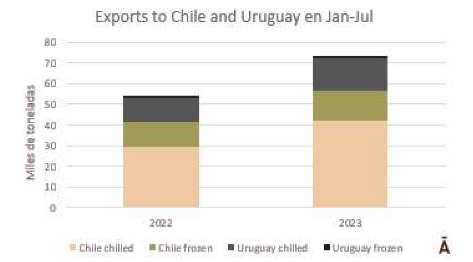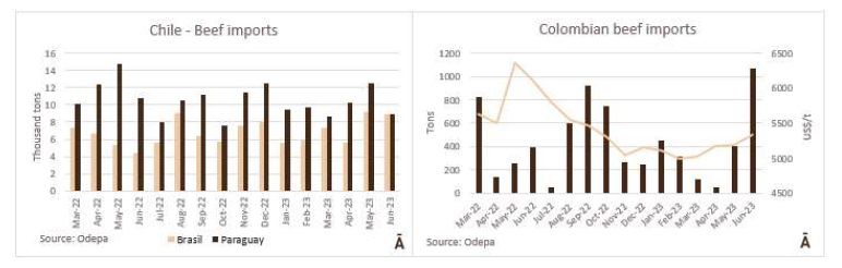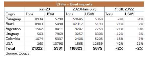 由于智利牛肉進(jìn)口牛價(jià)格的下降,巴西牛肉在國(guó)際市場(chǎng)上表現(xiàn)出競(jìng)爭(zhēng)力。根據(jù)Odepa的數(shù)據(jù),6月份,8903噸巴西牛肉抵達(dá)智利,這是今年迄今為止的最高月度產(chǎn)量,與巴拉圭的牛肉數(shù)量持平。來(lái)自哥倫比亞的牛肉量也大幅增加,達(dá)到1074噸,是過去至少兩年來(lái)的最高出口量。2023年上半年,智利進(jìn)口了59645噸牛肉,比2022年同期減少了8%。