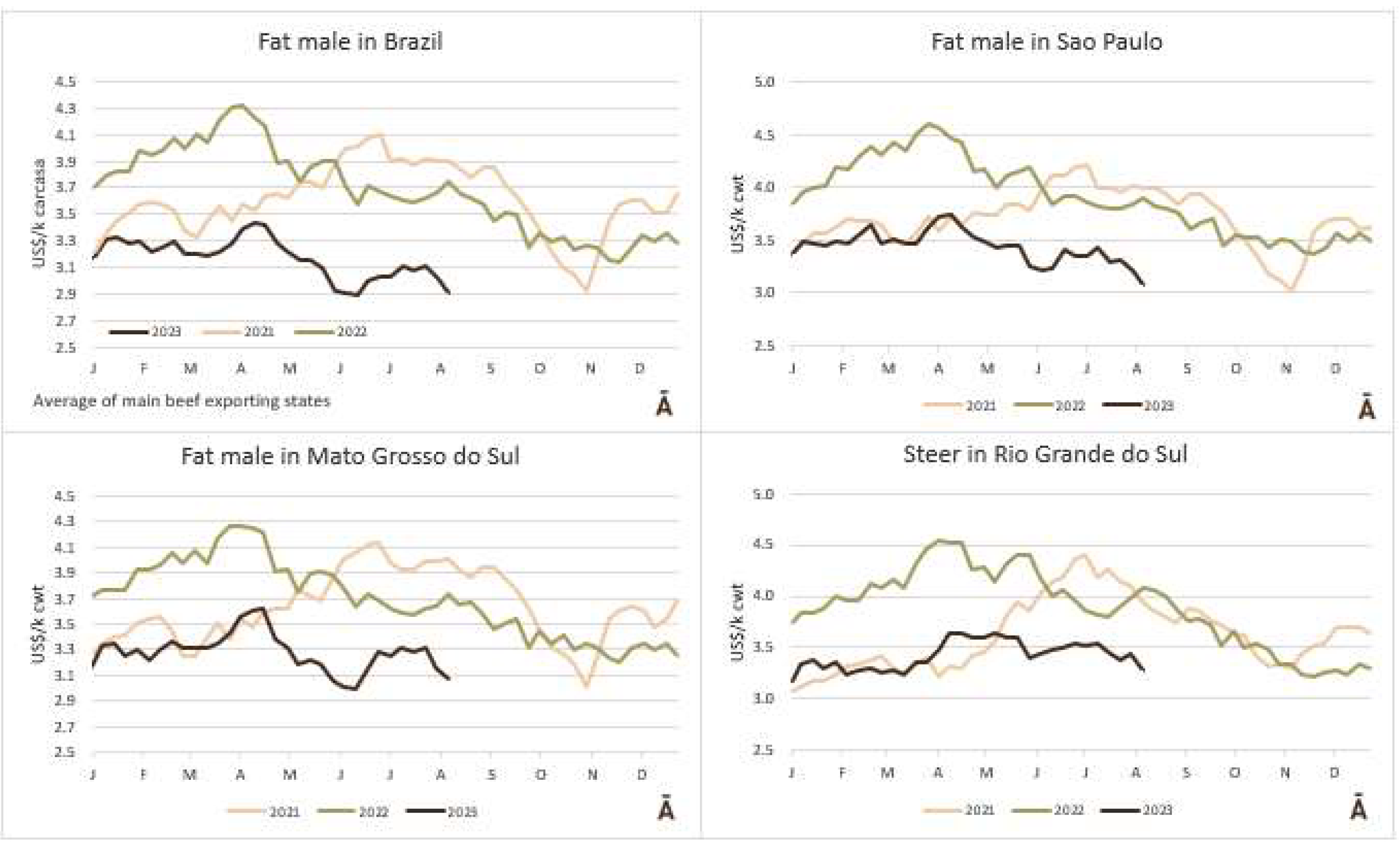屠宰牛價(jià)格本周繼續(xù)呈下降趨勢(shì)。根據(jù)蘇格蘭咨詢公司的參考資料,在圣保羅本周初,公牛價(jià)格是226.5雷亞爾/15公斤免稅,30天內(nèi)付清,比上一次低了5雷亞爾。所謂的屠宰時(shí)不到30個(gè)月“中國(guó)牛”,溢價(jià)5雷亞爾/15公斤的報(bào)價(jià),本周也下跌了R$5/15公斤。巴西的主要養(yǎng)牛州平均價(jià)格為195.7雷亞爾/15公斤,比上周下降了1.2雷亞爾。批發(fā)市場(chǎng)的牛肉價(jià)格在本月前幾天上漲后略有回落。