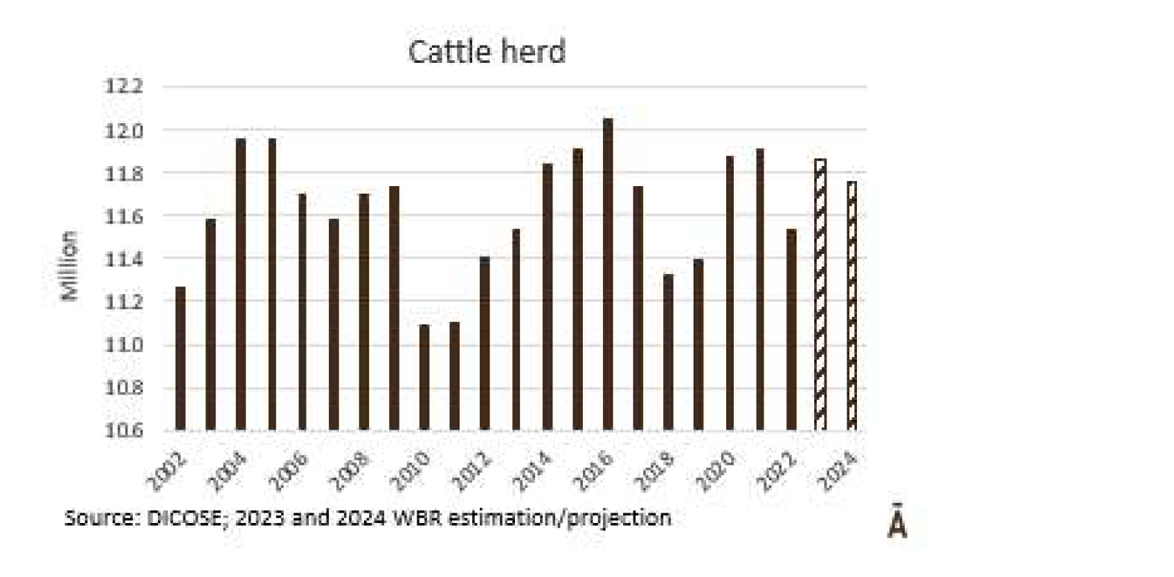 事實(shí)上,2022/23財(cái)政年度的牛庫(kù)存有所增加。畜牧部在9月份報(bào)告初步數(shù)據(jù)時(shí),顯示這個(gè)數(shù)字肯定會(huì)比去年多出30-35萬(wàn)只。當(dāng)畜牧部在9月份報(bào)告初步數(shù)據(jù)時(shí),這個(gè)數(shù)字肯定會(huì)比去年多出300-35萬(wàn)只。一方面,屠宰量急劇下降,從2021/22年度的274萬(wàn)頭下降到215萬(wàn),減少了57萬(wàn)頭牛??偟膩?lái)說(shuō),鑒于2022年下半年活牛產(chǎn)量幾乎為零,除上半年增長(zhǎng)外,兩年的活牛出口略有收縮。除此之外,還有對(duì)良好產(chǎn)仔和斷奶的預(yù)期。根據(jù)INIA妊娠研討會(huì)的數(shù)據(jù),2022年的妊娠率達(dá)到了80%。因此,隨著懷孕和斷奶的時(shí)間減少,6月30日統(tǒng)計(jì)的小牛數(shù)量幾乎肯定超過了290萬(wàn)頭。考慮到出欄和小牛的進(jìn)入,牛群將增加約30-35萬(wàn)頭達(dá)到約1186萬(wàn)頭的數(shù)量。2023/24財(cái)政年,受干旱的影響,牛群數(shù)量很可能會(huì)減少。今年的INIA妊娠研討會(huì)報(bào)告稱,與前一年相比,妊娠率下降了9個(gè)百分點(diǎn),因此斷奶率將略高于60%。明年6月30日的小牛數(shù)量肯定會(huì)減少約30萬(wàn)達(dá)到260萬(wàn)頭。2023/24年初的國(guó)際市場(chǎng)狀況和對(duì)中國(guó)經(jīng)濟(jì)發(fā)展的預(yù)期不容樂觀,因?yàn)閺?qiáng)烈的購(gòu)買壓力將加快屠宰速度,因此屠宰量可能會(huì)接近200萬(wàn)頭牛,2023/24財(cái)政年度末的牛群數(shù)量可能會(huì)減少約10萬(wàn)頭。