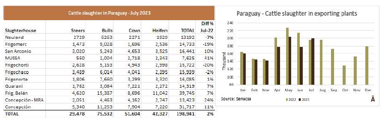 巴拉圭上半年的牛屠宰量月同比都低于2022年,下半年開始有所好轉(zhuǎn)。Senacsa報(bào)告稱,近19.9萬(wàn)頭牛進(jìn)入屠宰場(chǎng),比2022年7月多了近4000頭。良好的天氣和飼料條件可能會(huì)加快屠宰速度,因此下半年的屠宰動(dòng)態(tài)可能會(huì)高于2022年。最大的屠宰廠集團(tuán)Minerva,在四家屠宰廠加工了78544頭牛(占總數(shù)的39%),而管理三家屠宰廠的Concepcion集團(tuán)屠宰了61225頭牛(31%)。