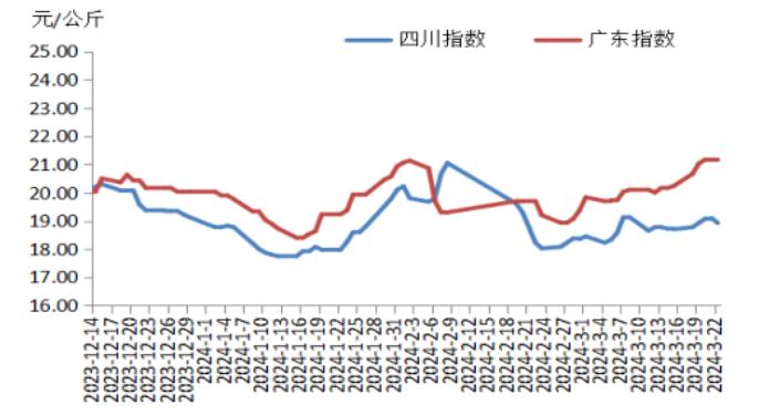 本周,四川豬肉周均價為每公斤18.96元,環(huán)比上漲1.3%,同比上漲2.2%,同比漲幅擴大2.0個百分點。川內(nèi)散養(yǎng)戶出欄積極性不高,適重豬源減少;家庭消費逐漸恢復(fù),豬肉經(jīng)銷商拿貨積極性提升,需求短時小幅增加。供減需增提振四川地區(qū)豬肉周均價環(huán)比小幅上漲。